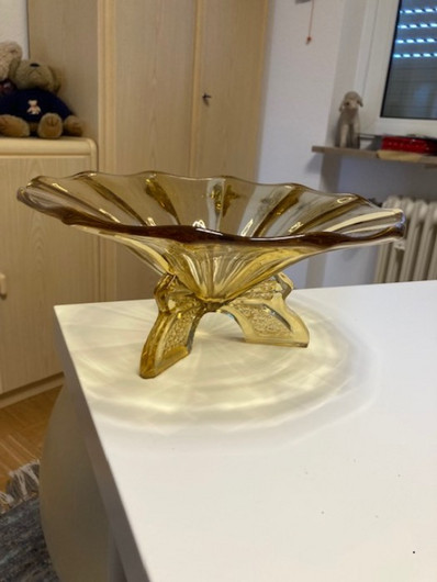 gelbe Kristall - oder Glasschale 50er Jahre Stil, 12 Dreiecke zusammengefügt mit geschwungenen Rand, 3 Füße mit eingelassenen Punkten, 2 sind an der Ecke etwas angestoßen , Schale wackelt deswegen aber nicht, innen kleine Gebrauchsspuren (Kratzer) Würde mich freuen, wenn Omas Schale, die immer auf ihrem Tisch in der guten Stube stand in gute Hände käme.
